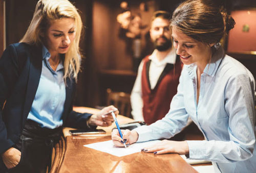 Now listen again and do yourself the front desk woman’s part as many times as necessary for a good performance. Then, record it and send the audio to your teacher.